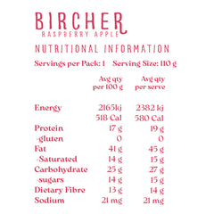 Ingredients: Almonds, coconut*, sunflower seeds, pumpkin seeds, dried apples* (8.7%), currants*, chia seeds, ground linseed, hemp seeds, freeze-dried raspberries (1%), apple powder (0.9%), monk fruit powder (*certified organic ingredient)